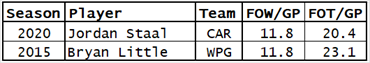 Had Little and Staal played for the same team, Little would have sent out to take faceoffs less frequently. But Little’s competition for faceoff duties on his team wasn’t Staal. It was Mark Scheifele (FO% of 44%), Adam Lowry (46%) and Alexander Bermitsov (40%).  Little took lots of faceoffs because he was the best player at winning faceoffs on Winnipeg in 2015-16.
