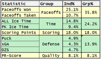 TOI/GP accounts for 15% of CR3-Score and PKT/GP accounts for 10%. While PKT/GP is a time statistic, it is used in CR3 to reward centers that play defense.
