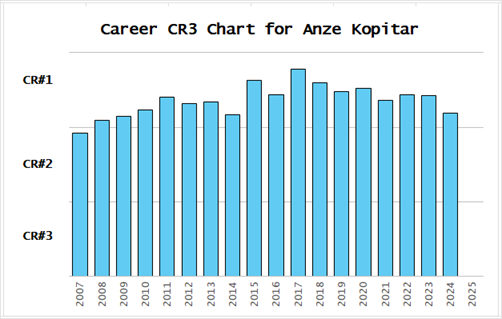 Let’s start off at the top, according to CR3. From 2007 through 2024, the best center in the league has been Anze Kopitar (L.A.). His career CR3 chart is below.