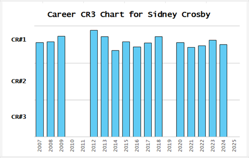 Crosby’s missing columns were caused by injuries: he missed the minimum games played requirement for CR3 in those seasons. Do you remember when there was great concern about Crosby’s future due to repeated injuries, back in 2011? Pepperidge Farm remembers.