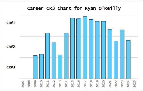 O’Reilly’s Career CR3 chart is much more hill-shaped than other top-level centers. A player generally reaches a peak level of skill as a center quickly and doesn’t lose that skill as rapidly as other skills decline late in his career. The reason for O’Reilly’s low CR3-Scores from 2009-10 through 2014-15 was that he was a young player playing on teams that had Paul Stastny and Matt Duchene. He moved to Buffalo in 2015-16 and was immediately given ten more faceoffs per game. In 2022-23 he was traded to Toronto, and that was the first season he had fewer than 20 faceoffs per game since 2015-16.