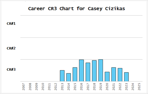 Players will be put into one of four CR3 categories based their CR3-Scores. A CR3-Score above 550 puts a player in the CR#1 category, which is a #1 center. CR3-Scores between 400 and 550 put a player in the CR#2 category, and CR3-Scores between 250 and 400 put a player in the CR#3 category. Players with a CR3-Score below 250 are uncategorized (which is, pedantically, a fourth category).