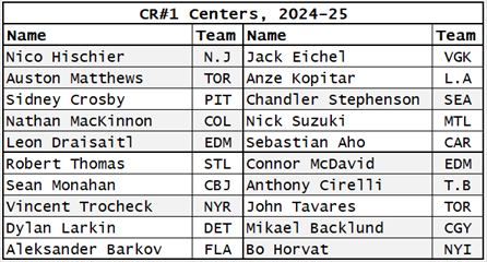 This final table should help you see that CR3 does a good job of identifying the best centers in the league, if you are still in doubt. Twenty players in 2024-25 were in the CR#1 category and they are shown below, listed from the highest rated Nico Hischier to the twentieth rated Bo Horvat.