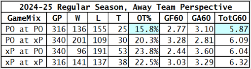 OT% is the percentage of games that went into overtime. Two PO teams playing each other (PO at PO) got to overtime less frequently than in any other type of game. I found that surprising. The only reason I can think that might have happened, and this is an extremely subjective opinion, is that the leading team late in a PO at the PO game was much more tenacious at holding their lead. Not only did they not want the other PO team to get a single point, but they also didn’t want to risk losing their two points for a win by going to overtime, where the second point was basically a toss-up. Against an xP team, they might have thought that if they gave up the tying goal, they would just win the game in OT. That opinion may be more than subjective: it could be imaginary.