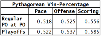The three data rows show: values from regular season games between two eventual playoff teams; values from playoff games; and the percent increase or decrease in playoff game values over regular season game values.