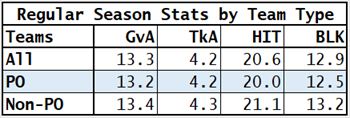 The differences between playoff and non-playoff teams are either trivial or small (HIT and BLK are about 5% different).