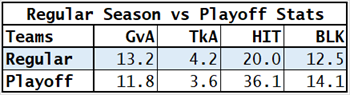 Regular Season vs Playoffs – TakeAways, GiveAways, Hits and Blocked Shots